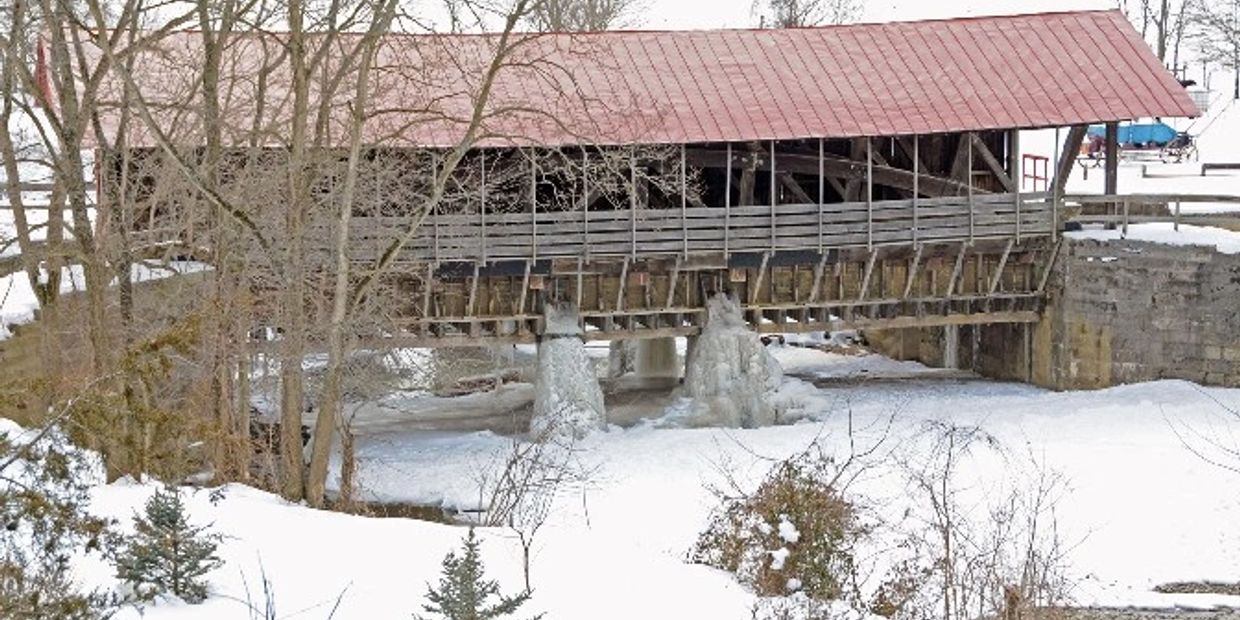 The current aqueduct was rebuilt in 1846 after the original 1843 open-trough wooden aqueduct washed out in a flood. To restore the canal quickly, engineers adapted a partially built covered bridge into a new aqueduct, a hybrid structure not seen anywhere else.